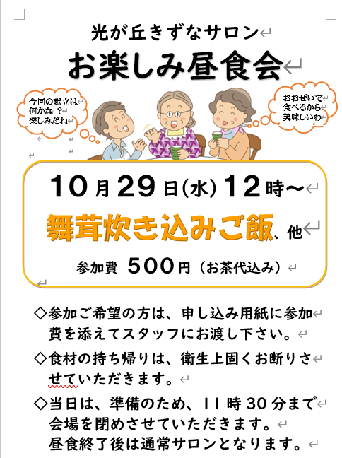 直近では「ひな祭りの五目寿司」「タケノコご飯」など、季節を感じる手作り料理をご提供しました。