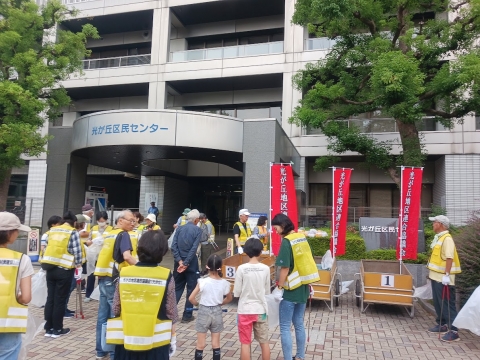 終了後、光が丘警察署の方々と一緒に駅周辺の駐輪場を合同パトロール、鍵のかかっていない自転車に黄色い札をつけ、注意喚起しました。