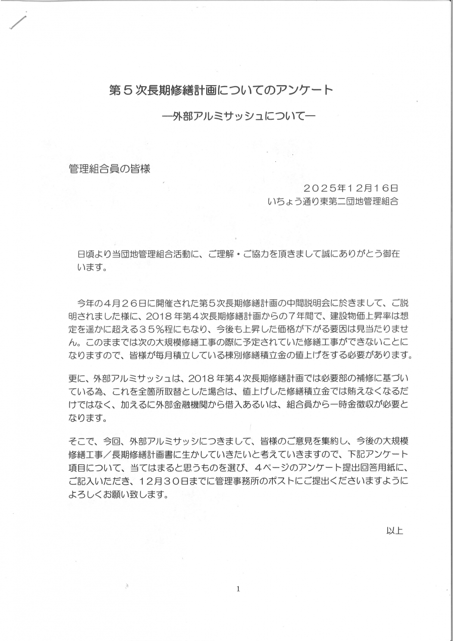 2025年12月16日 第5次長期修繕計画についてのアンケートにご協力下さい。