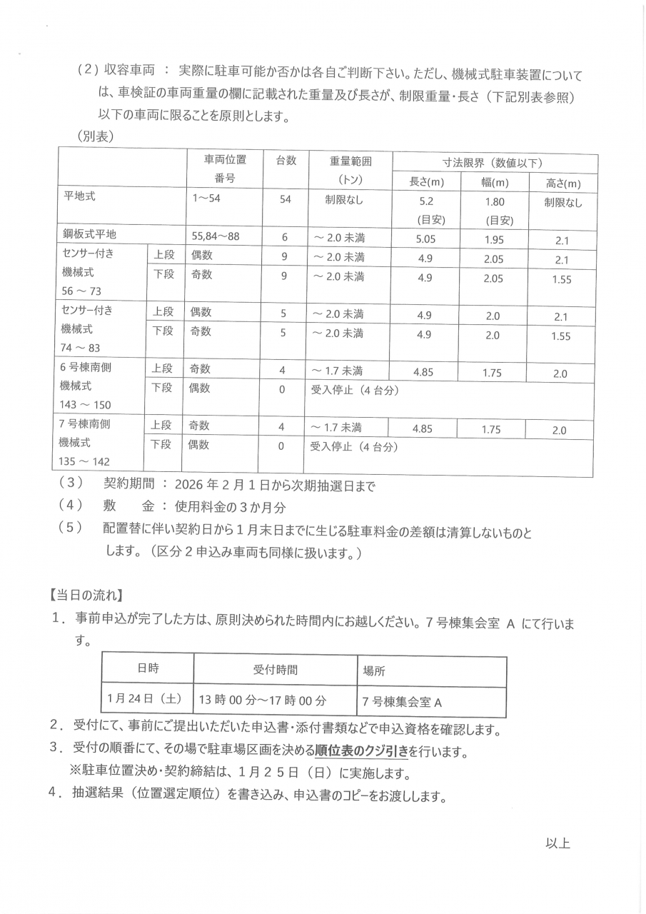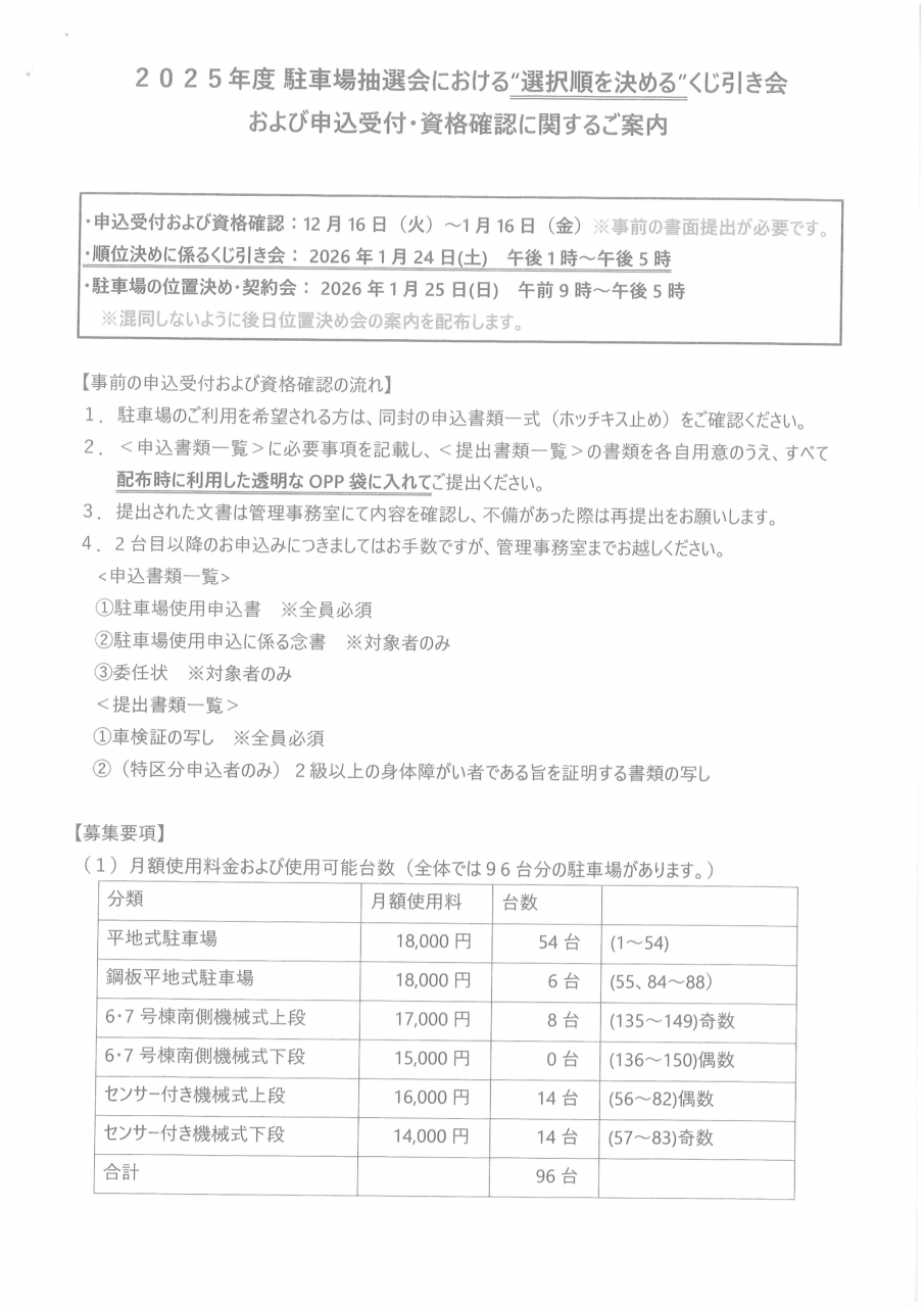 2025年12月17日 2025年度駐車場抽選会実施のご案内