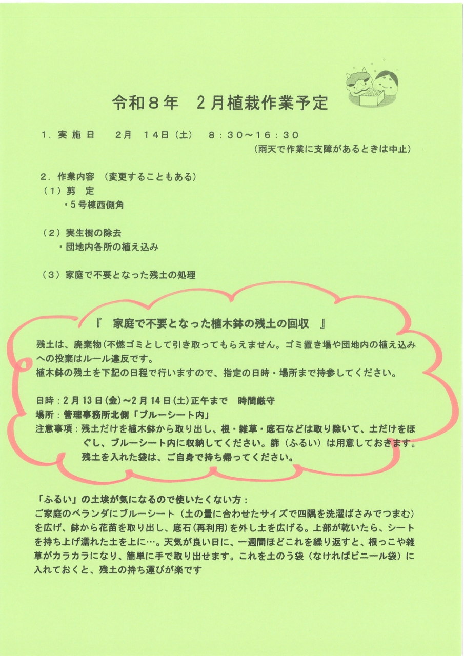 2026年1月20日 2月植栽作業予定 家庭で不要になった残土の回収ご案内