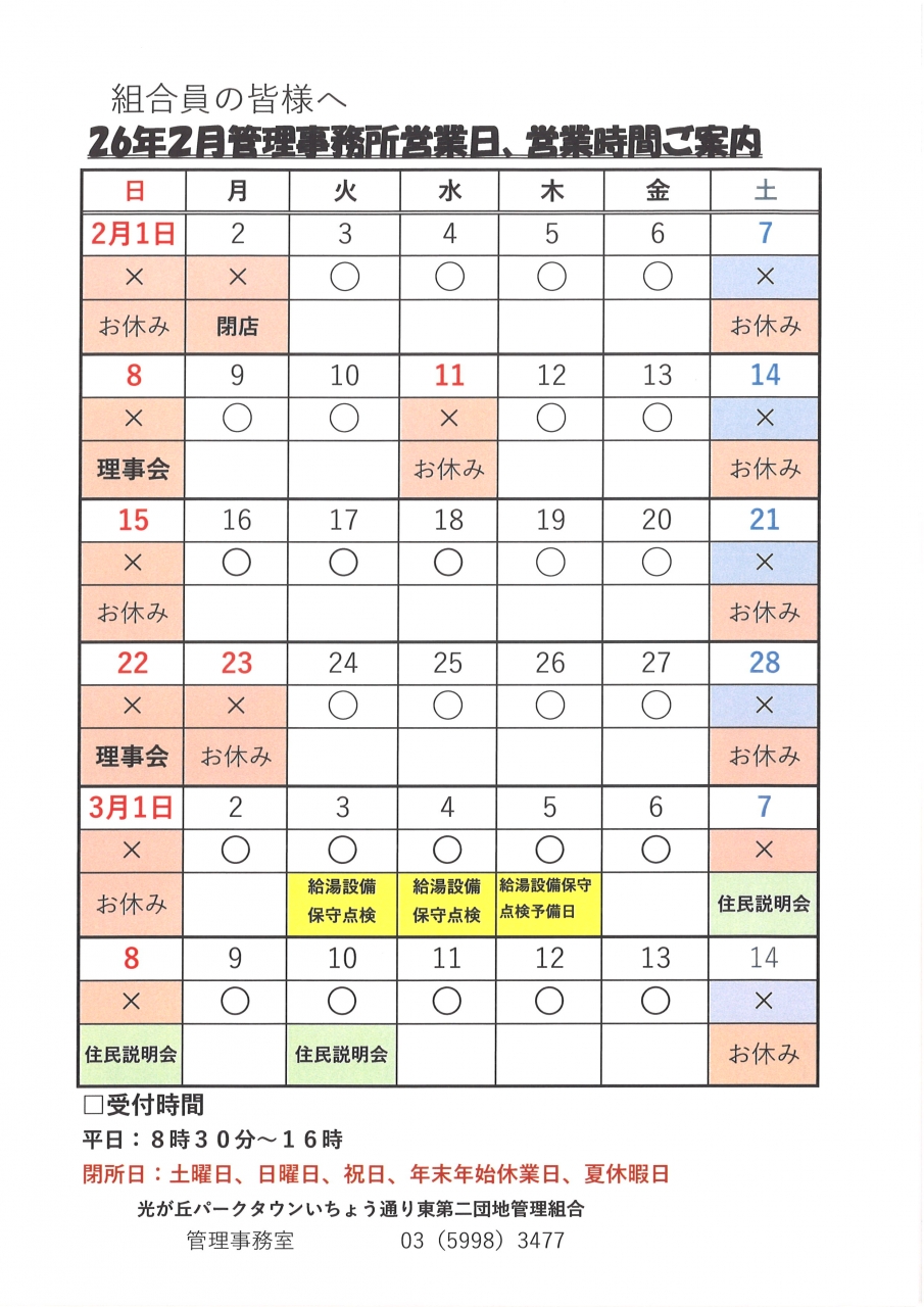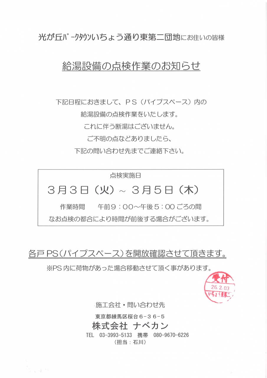 2026年2月8日 給湯設備定期点検のお知らせ 在宅の必要はございません。