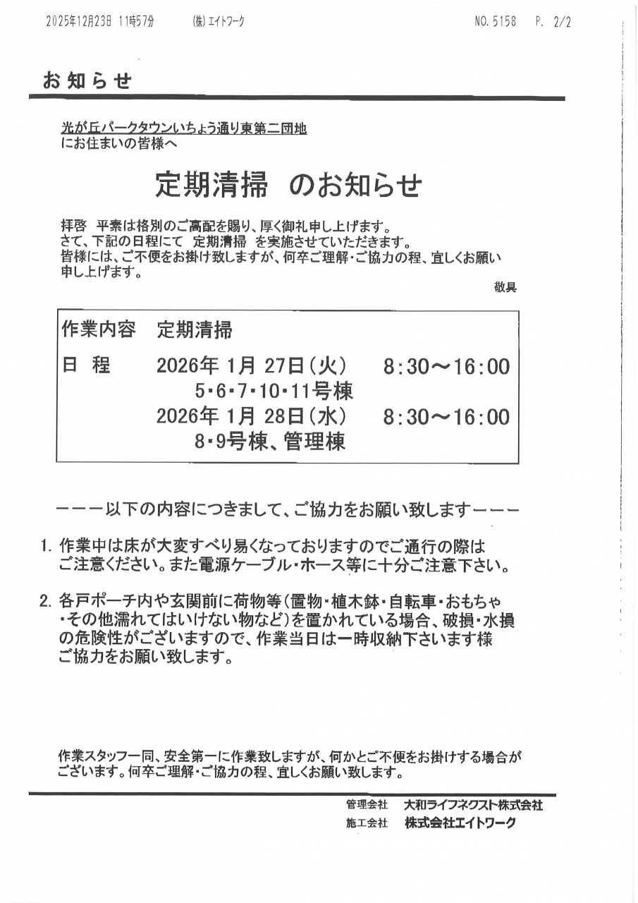 2025年12月15日 雑排水管定期清掃のお知らせ