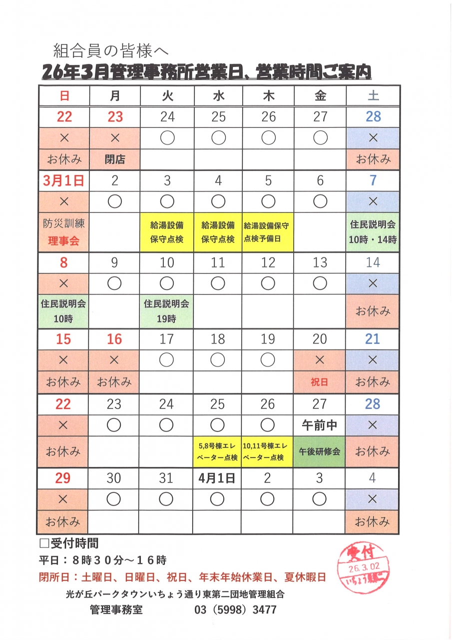 2026年3月1日 26年3月管理事務所営業案内