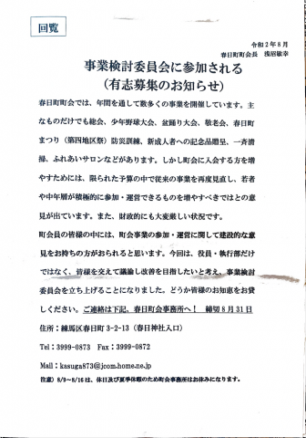 町会員の皆様の中には、町会事業の参加・運営に関して建設的な意見をお持ちの方がおられると思います。今回は、役員・執行部だけではなく、皆様を交えて議論し改善を目指したいと考え、事業検討委員会を立ち上げることになりました。どうか皆様のお知恵をお貸しください。ご連絡は下記、春日町会事務所へ!