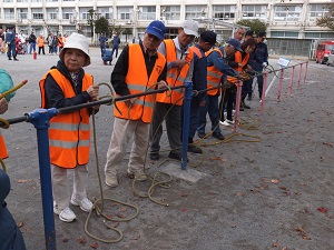 11月11日(日)10時~12時半に練馬小学校にて春日町地域の防災訓練が行われました。町会員・避難拠点連絡協議会・練馬消防署貫井出張所・同じく第七分団・練馬区危機管理室・練馬小学校正副校長・練馬高校の皆さんなど総勢150人が参加。初期の消火練習、脱出時のロープワーク、救急救護、防災資器材の展示・操作、アルファ米の炊き出しなど短時間ですが内容の濃い訓練でした。11月4日に実施された防災コンクールの軽可搬ポンプの部で4位入賞した春日町部隊の消火模範演技も行なわれ、拍手に包まれました。本当に役立つことばかりでした。次回も大勢の町会員の参加を期待致します。