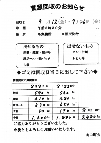 9月の資源回収は「12日(金)」と「26日(金)」です。