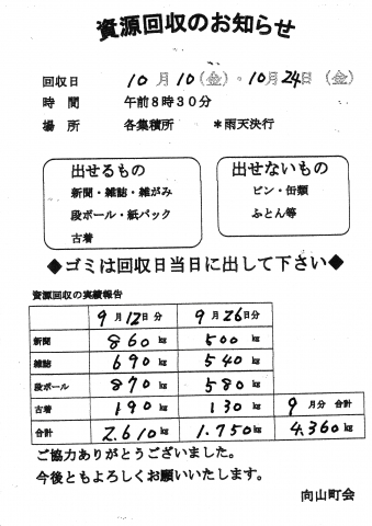 向山町会の資源回収は、毎月第二・第四金曜日です。