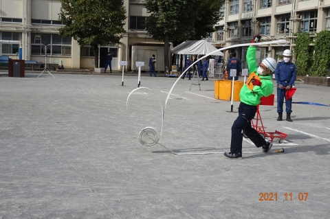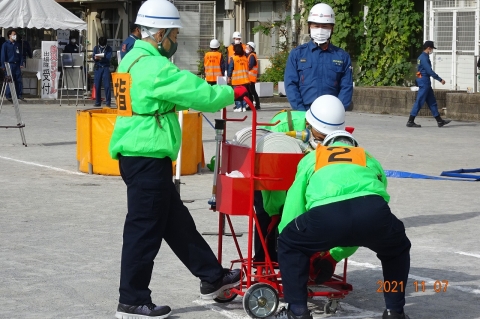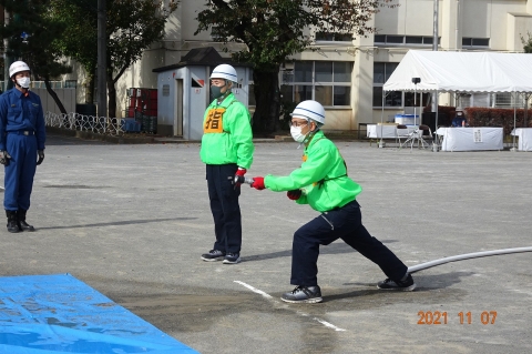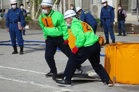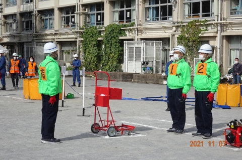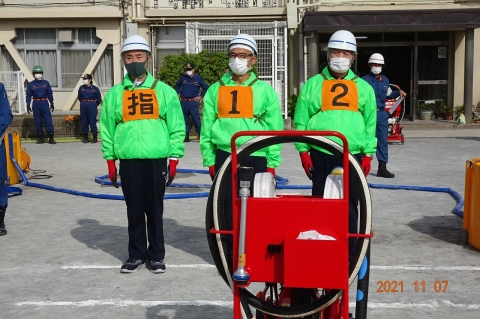 3人1組となって、移動式の軽可搬ポンプを操作して消化行動を行い、ポンプの操作技能、指揮や応答の適切性、ホースの取り扱い、放水要領等について消防署員が採点し、総合点により順位を競うコンクールです。