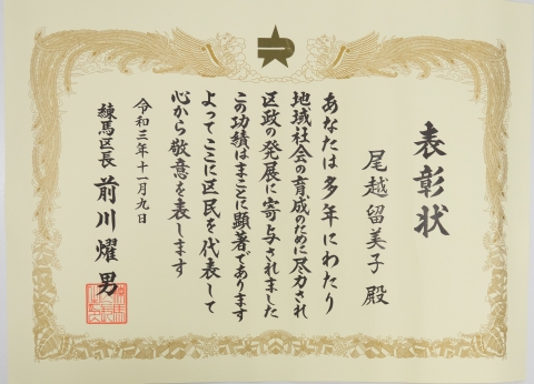 尾越さんは、練馬区青少年育成第一地区委員会の委員として、地域で様々な事業の実施や青少年健全育成の啓発活動、不健全図書自動販売機等実態調査などに活躍されました。