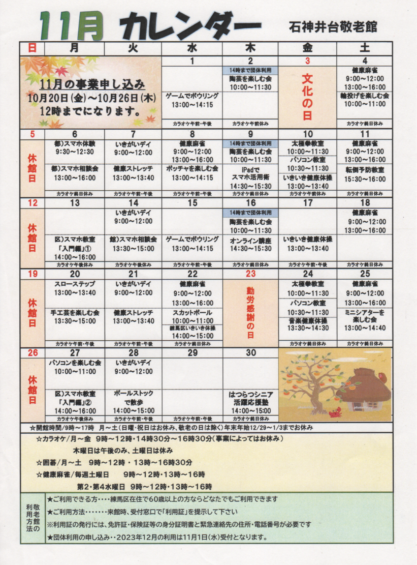 11月石神井台敬老館カレンダー
