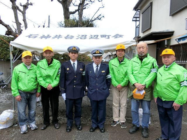 令和6年4月6日石神井警察署山上署長尾崎交通安全協会会長が沼辺町会テントに来られました