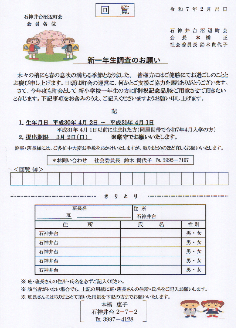 石神井台沼辺町会回覧板 新一年生調査のお願い