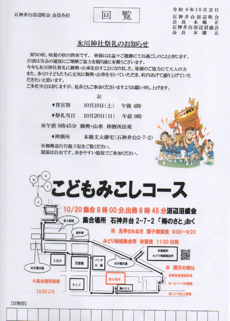 石神井台沼辺町会回覧板 氷川神社祭礼のお知らせ