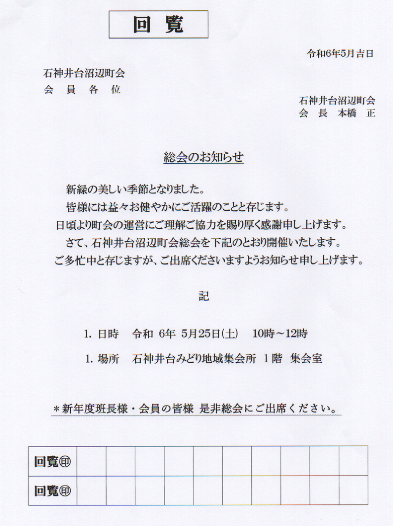 石神井台沼辺町会 回覧板 総会のお知らせ