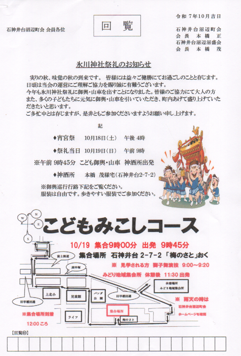 石神井台沼辺町会 回覧板 氷川神社祭礼のお知らせ