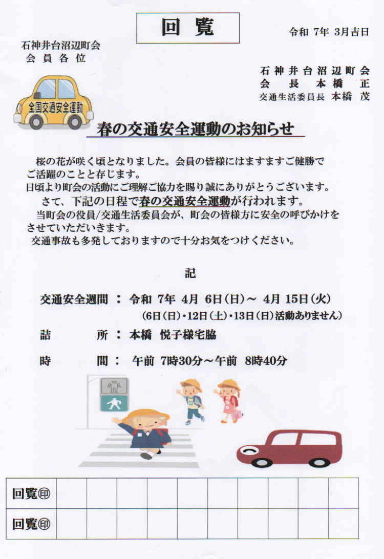 石神井台沼辺町会 回覧板 春の交通安全運動のお知らせ