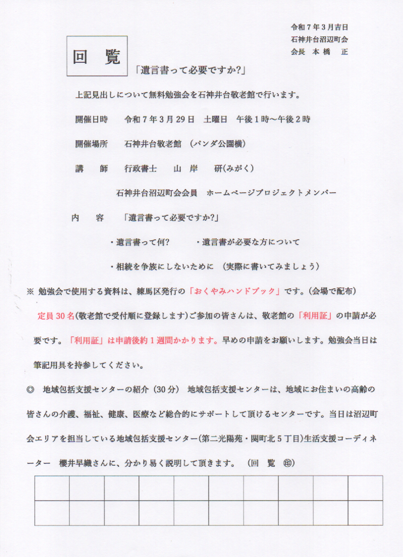 石神井台沼辺町会回覧板 「遺言書って必要ですか?」