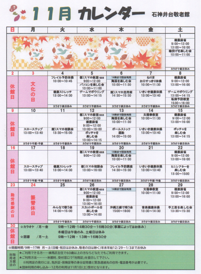 11月 カレンダー 石神井台敬老館