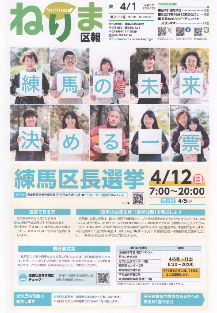 ねりま区報 4/1 練馬の未来を決める一票 練馬区長選挙 4/12 日曜日