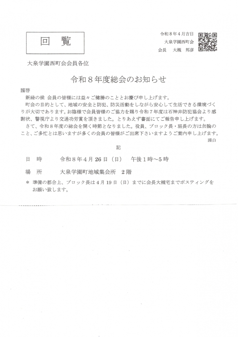 4月26日(土)大泉学園西町会 令和8年度総会を行います。