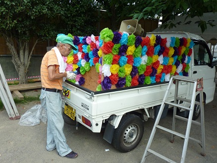 【山車と給水車をデコレーションするO防災部員、Y防災部員】