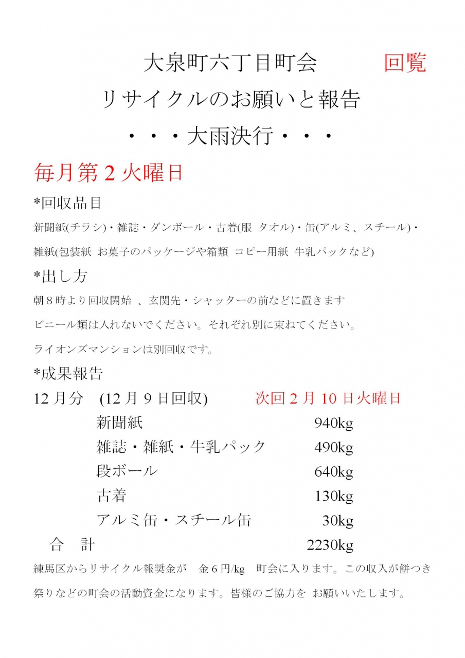 次回の資源回収は2月10日です。
