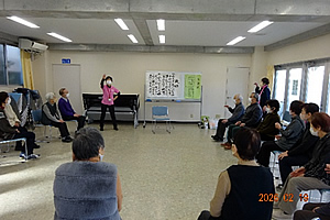 令和8年2回目の「能トレ体操」は北風の強い中、2月19日(木)に行いました。18名の方が参加してくださいました。 準備体操の後、合唱から開始。今回は『故郷』と『早春賦』の2曲を最初は全員で合唱し、次に2グループに分かれての合唱です。第1のグループが先に『早春賦』を歌い始め、ワンテンポ遅れて第2グループが『故郷』です。ちょっと難しかったですが、不思議にうまく2重奏となりました。