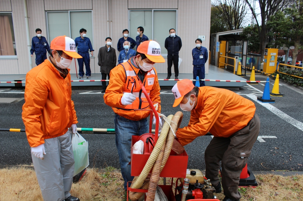 2ヶ月に一度、ポンプの稼働、給水、放水、スタンドパイプなどの消火訓練を行っています。