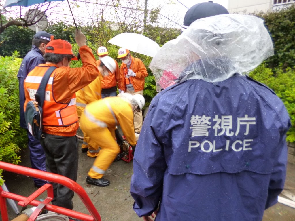 公開訓練 五丁目「えごの木緑地」 雨天の中、光が丘警察が参加 一丁目「中郷緑地」